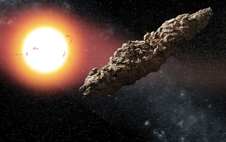 Το ουράνιο σώμα 1I/Ουμουαμούα (καλλιτεχνική απεικόνιση), το πρώτο διαστρικό αντικείμενο που παρατηρήθηκε να διασχίζει το ηλιακό σύστημα, πέρασε κοντά από τη Γη το 2017