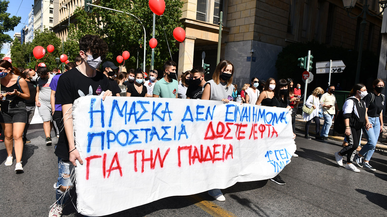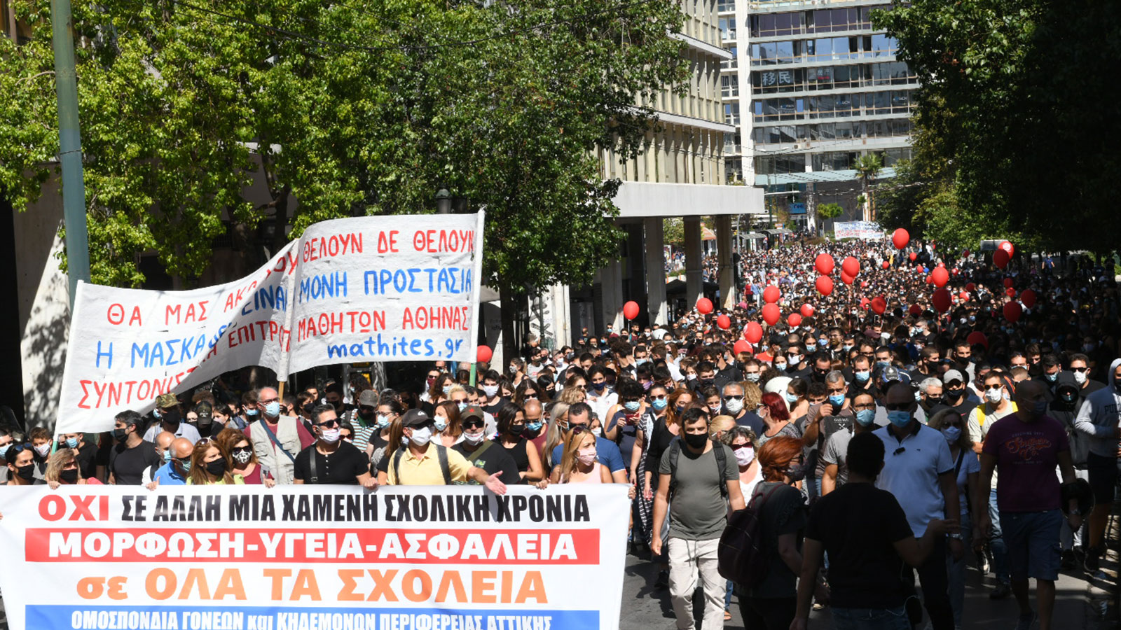 Στη συνέχεια έκαναν πορεία σε κεντρικούς δρόμους της Αθήνας. Φωνάζοντας συνθήματα που συμπύκνωναν τα αιτήματά τους, όπως «Η μάσκα δεν είναι η μόνη προστασία, δώστε λεφτά για την Παιδεία», «Κάτω από τη μάσκα έχουμε φωνή, μόρφωση και υγεία σε κάθε μαθητή» και «Με μάσκα – παγουρίνο δεν βγαίνει η πανδημία, δώστε λεφτά για την Παιδεία», έφτασαν στο Σύνταγμα, στέλνοντας, με τη δυνατή τους φωνή, και εντός του Κοινοβουλίου το αίτημα για ουσιαστικά μέτρα προστασίας της υγείας τους.