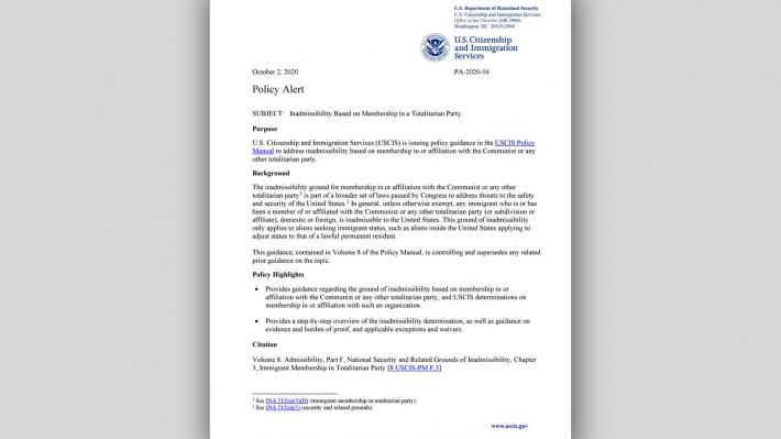 Η Ομοσπονδιακή Υπηρεσία Μετανάστευσης των ΗΠΑ με οδηγία της που εκδόθηκε στις 2 Οκτώβρη, επικαιροποιεί νόμο του 1952, απαγορεύοντας την είσοδο στις ΗΠΑ με σκοπό τη μόνιμη παραμονή σε πολίτες που είναι ή υπήρξαν μέλη Κομμουνιστικών Κομμάτων στο εσωτερικό ή το εξωτερικό.