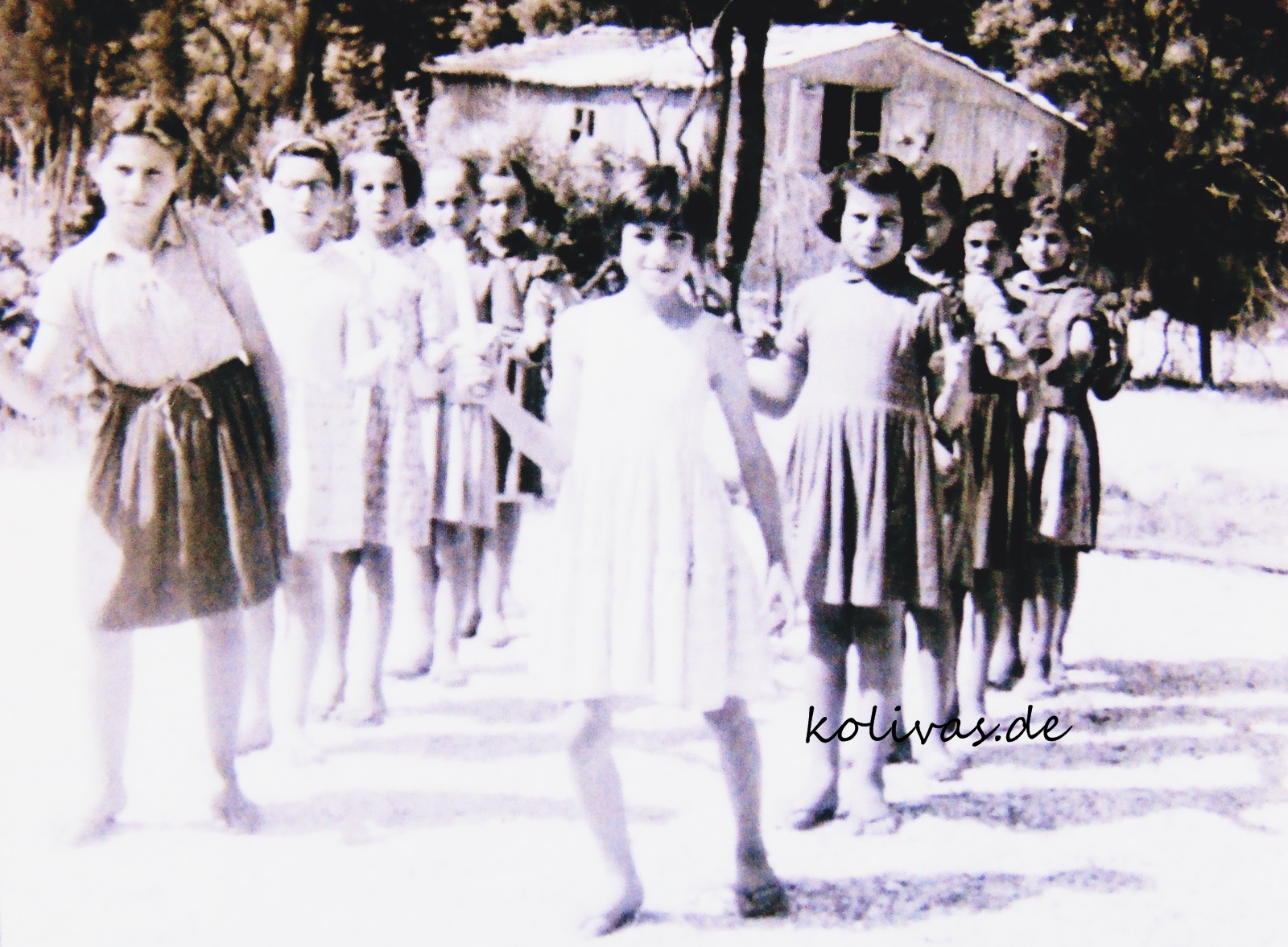 Οι εικονιζόμενες μαθήτριες είναι όλες Αλεξανδρίτισσες (από τον Αλέξανδρο Λευκάδας) – αναγνωρίζετε κάποιες; Στο φόντο της φωτογραφίας διακρίνεται ανάμεσα σε κυπαρίσσια και ελιές το σπίτι που έμενε την εποχή εκείνη η οικογένεια του Δήμου Βρεττού. Δεν υπάρχει πια σήμερα σε αυτή τη μορφή.