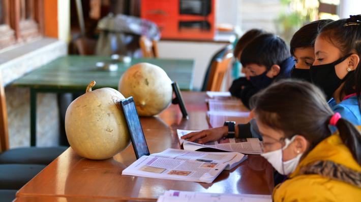 Οι μαθητές φορώντας τα μπουφάν τους, προσπαθούν να κάνουν τηλεμάθημα με ένα δανεικό κινητό και ένα παλιό λάπτοπ, για να μπορέσουν να μπουν στην πλατφόρμα του υπουργείου Παιδείας.