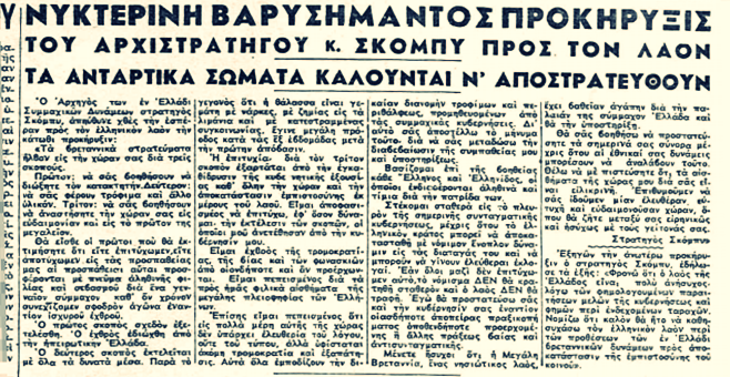 Προκήρυξη του Σκόμπυ («Καθημερινά Νέα», Σάββατο 2 Δεκεμβρίου 1944)