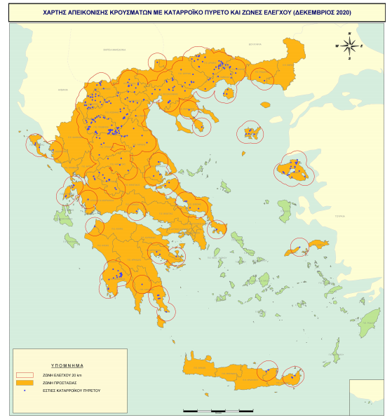 Εικόνα 1. Εστίες ΚΠ στην Χώρα: απεικόνιση Ζωνών Ελέγχου και Προστασίας, σήµανση επιβεβαιωµένων έως 23.12.2020 εστιών µε µπλε χρώµα