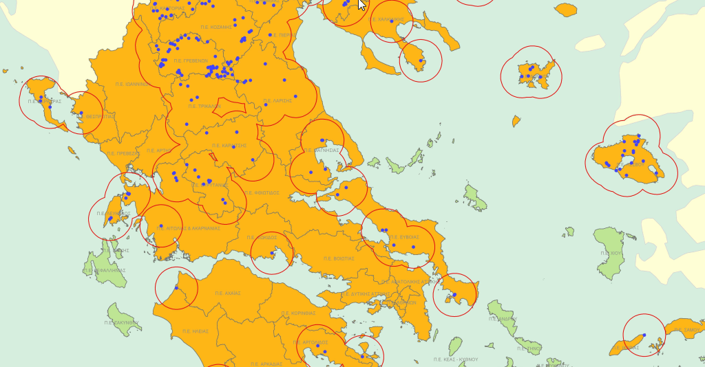 Κοζάνης, Φλώρινας, Γρεβενών, Καστοριάς, Καβάλας, Ξάνθης, ∆ράµας, Ροδόπης, Θεσσαλονίκης, Σερρών, Ηµαθίας, Πιερίας, Πέλλας, Χαλκιδικής, Κιλκίς, Τρικάλων, Λάρισας, Καρδίτσας, Μαγνησίας, Αιτωλοακαρνανίας, Ευρυτανίας, Φωκίδας, Εύβοιας, Νήσων, Λακωνίας, Μεσσηνίας, Αργολίδας, Ηλείας, Θεσπρωτίας, Ηρακλείου και Λασιθίου, καθώς και στα νησιά της Λέσβου, της Λήµνου, της Ικαρίας, της Κέρκυρας και της Λευκάδας.