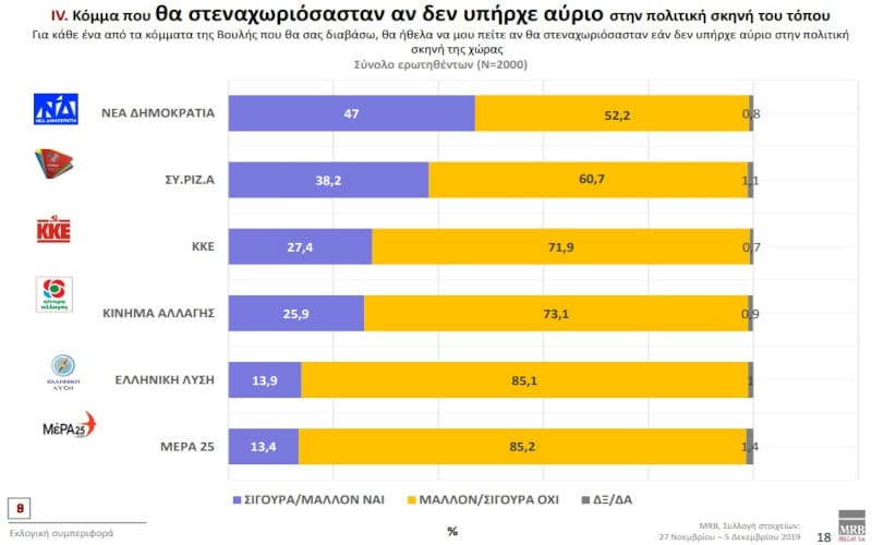 Αυτό αφορά στο “ποιο κόμμα θα θέλατε να παραμείνει οπωσδήποτε και να μην εξαφανιστεί ποτέ από το πολιτικό σκηνικό;”. Οι δυο πρώτες θέσεις, με ποσοστά περί το 30% και 40%, αφορούν όπως είναι αναμενόμενο τη ΝΔ και το ΣΥΡΙΖΑ, αντιστοιχώντας χοντρικά και στην εκλογική τους απήχηση. Ιδιαίτερα ενδιαφέρον είναι ωστόσο το γεγονός πως πάνω από ένας στους τέσσερις ψηφοφόρους, και συγκεκριμένα το 27%, απαντά πως το κόμμα που θέλει να υπάρχει για πάντα είναι το ΚΚΕ.