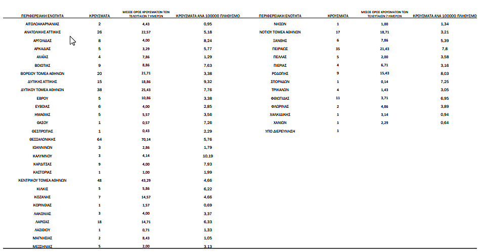 Δείτε στον παρακάτω πίνακα την γεωγραφική κατανομή των κρουσμάτων
