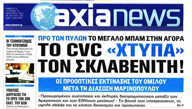 Σύμφωνα με πρωτοσέλιδο δημοσίευμα της οικονομικής και πολιτικής εφημερίδας «AXIA NEWS» που διανέμεται κάθε Σαββατοκύριακο, βρίσκεται «προ των πυλών το μεγάλο μπαμ στην αγορά» που αφορά στο ενδιαφέρον του αμερικανικού fund CVC Capital για τον «Σκλαβενίτη».