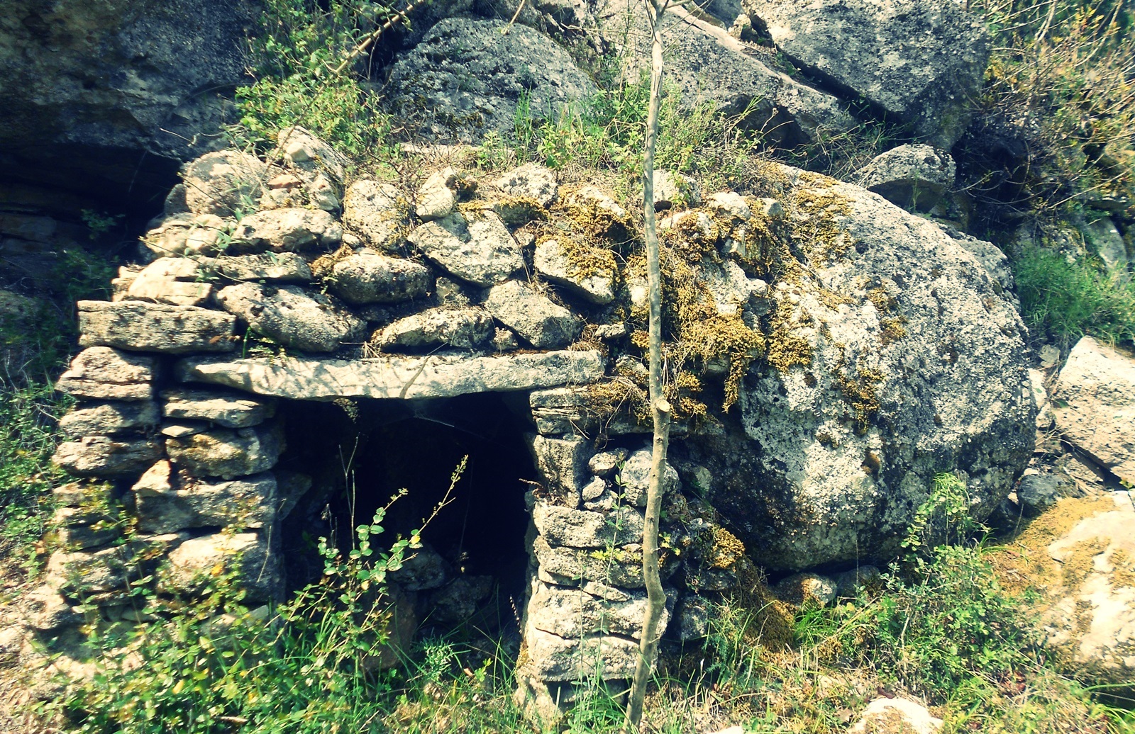 Σε μια άκρη, στα δεξιά όπως μπήκα σε ένα κάπως ίσωμα, ήταν μια μικρή πέτρινη καλύβα. Με θόλο, όπως στους γνωστούς βόλτους στην Εγκλουβή. Με το ζόρι σπήλωναν δυο-τρεις άνθρωποι. Καλά διατηρημένη όμως ακόμα. Αυτός που την έκανε είχε πρακτικό μυαλό καθώς εκμεταλλεύτηκε το φυσικό κοίλωμα των βράχων, εξοικονομώντας έτσι πέτρες και εργασία.