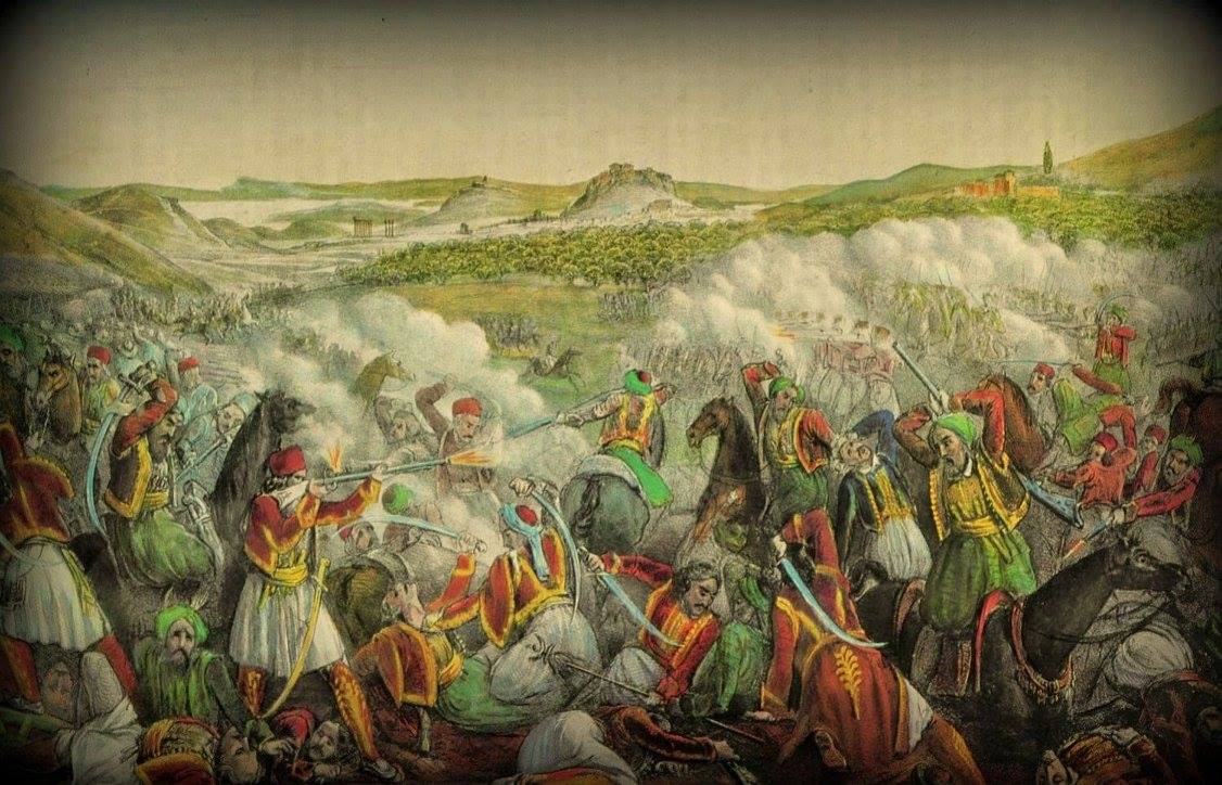 Η Μάχη του Αναλάτου κατά το 1827 στην Αθήνα. Χρωμολιθογραφία του Αλέξανδρου Ησαΐα, [Βενετία, 1839]