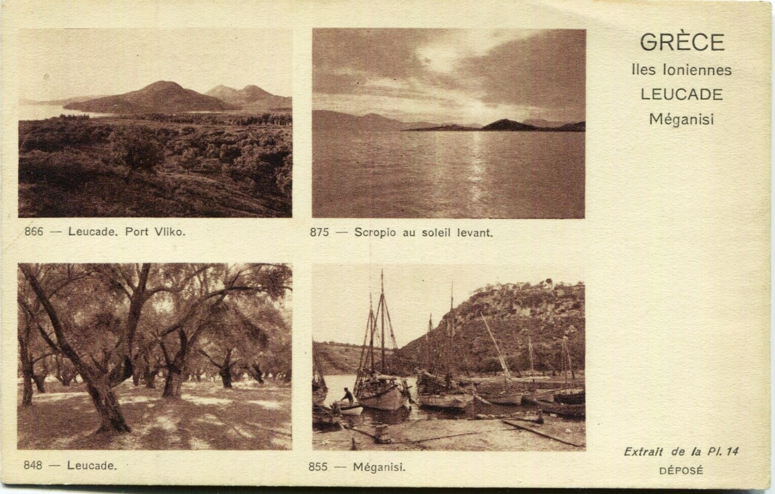 Καρτ ποστάλ της Λευκάδας με τέσσερις φωτογραφίες του Φρεντερίκ (Φρεντ) Μπουασονά: Το λιμάνι του Βλυχού, ο ελαιώνας της πόλης της Λευκάδας, o Σκορπιός στον ανατέλλοντα ήλιο και το Μεγανήσι.