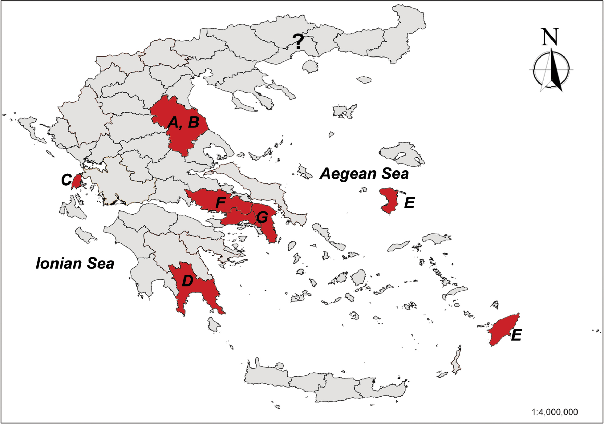 Η εξάπλωση στην Ελλάδα του ενδημικού γένους Daphniola. A. D. exigua and B. D. magdalenae, Larissa prefecture; C. D. dione, Lefkada Island; D. D. hadei, Lakonia prefecture; E. Daphniola sp., Rhodos and Chios Islands; F. D. eptalophos Parnassos Mt.; G. D. louisi Attiki prefecture; (?) the record of D. exigua (as Horatia (Daphniola) exigua pangaea) in Kavala prefecture (Reischütz 1984) should be re-examined because it is based on empty shells identification. (Πηγή)