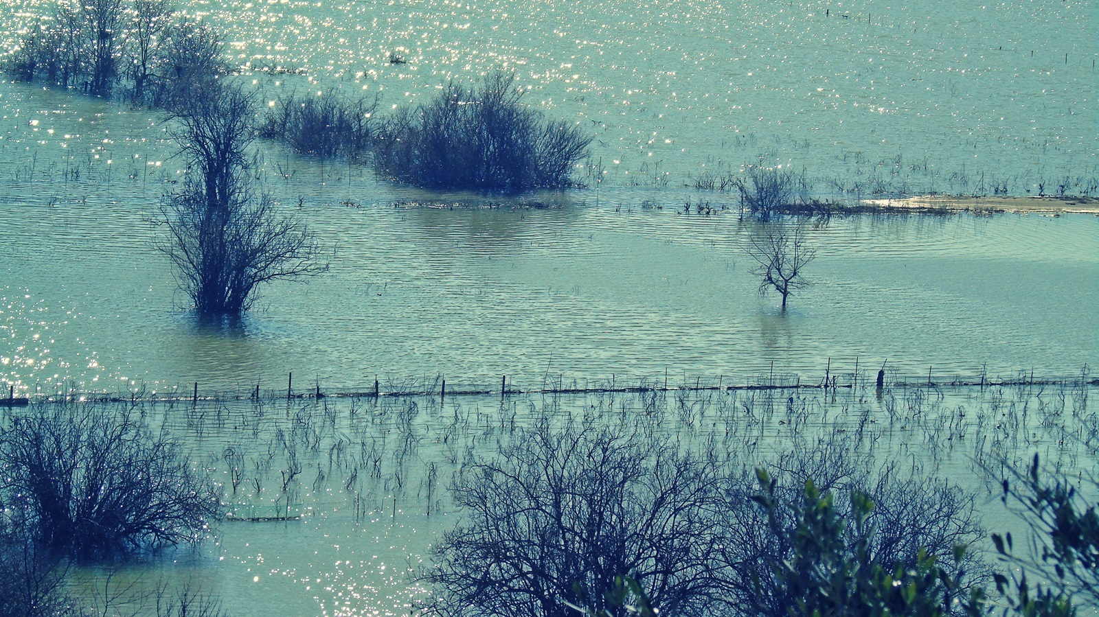 «Ιρλανδική τάφρο» θυμίζει ο αγροτικός δρόμος που διασχίζει το λιβάδι της Καρυάς, αφού σε κάποια σημεία του έχει γίνει πλέον αόρατος καθώς έχει σκεπαστεί από τα νερά που έχουν υπεργεμίσει το λιβάδι.