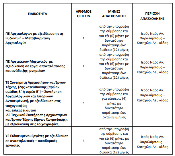 Η Εφορεία Αρχαιοτήτων Αιτωλοακαρνανίας και Λευκάδας προκηρύσσει την πρόσληψη επιστημονικού προσωπικού και λοιπών ειδικοτήτων με σύμβαση εργασίας ιδιωτικού δικαίου ορισμένου χρόνου (ΙΔΟΧ) για τις ανάγκες του υποέργου 1 «Στερέωση και αποκατάσταση Ιερού Ναού Αγίου Χαραλάμπους στο Κατωχώρι Λευκάδας» που υλοποιείται με την μέθοδο της αρχαιολογικής αυτεπιστασίας από την ΕΦΑ Αιτωλοακαρνανίας και Λευκάδας.