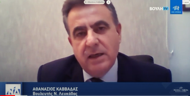 «Ομιλία στη Βουλή μέσω τηλεδιάσκεψης πραγματοποίησε ο Βουλευτής Ν. Λευκάδας Αθανάσιος Καββαδάς, σε νομοσχέδιο του Υπουργείου Οικονομικών για το μισθολόγιο και ζητήματα ανθρώπινου δυναμικού της Ανεξάρτητης Αρχής Δημοσίων Εσόδων (ΑΑΔΕ), στο οποίο περιλαμβάνονται σημαντικά μέτρα αντιμετώπισης της πανδημίας, καθώς και διατάξεις για τη χορήγηση προκαταβολής σύνταξης.