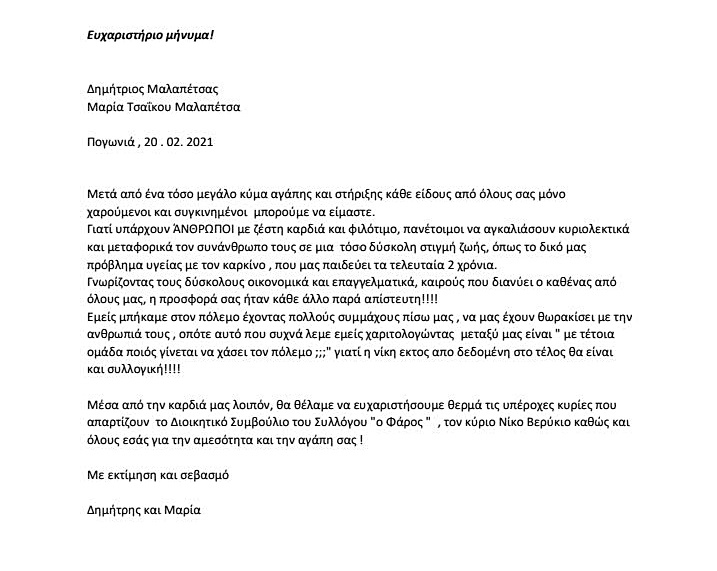 Ευχαριστήριο μήνυμα της οικογένειας Μαλαπέτσα από την Πογωνιά που μας κοινοποιήθηκε από τον Φιλανθρωπικό Σύλλογο Λευκάδας «Φάρος»
