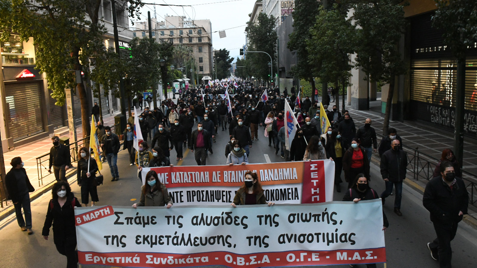 «Με καταστολή δε βγαίνει η πανδημία, κάντε προσλήψεις στα νοσοκομεία», «ΜΑΤ, βία, αυταρχισμός, ανθρώπινος δε γίνεται ο καπιταλισμός», «Δώστε λεφτά για υγεία και παιδεία, όχι στην καταστολή και την τρομοκρατία», φωνάζουν. Ενώ διαβεβαιώνουν πως η 8η Μάρτη αποτελεί «σύμβολο αγώνα» που θα οδηγεί τους αγώνες των εργαζομένων «και τούτο τον αιώνα».