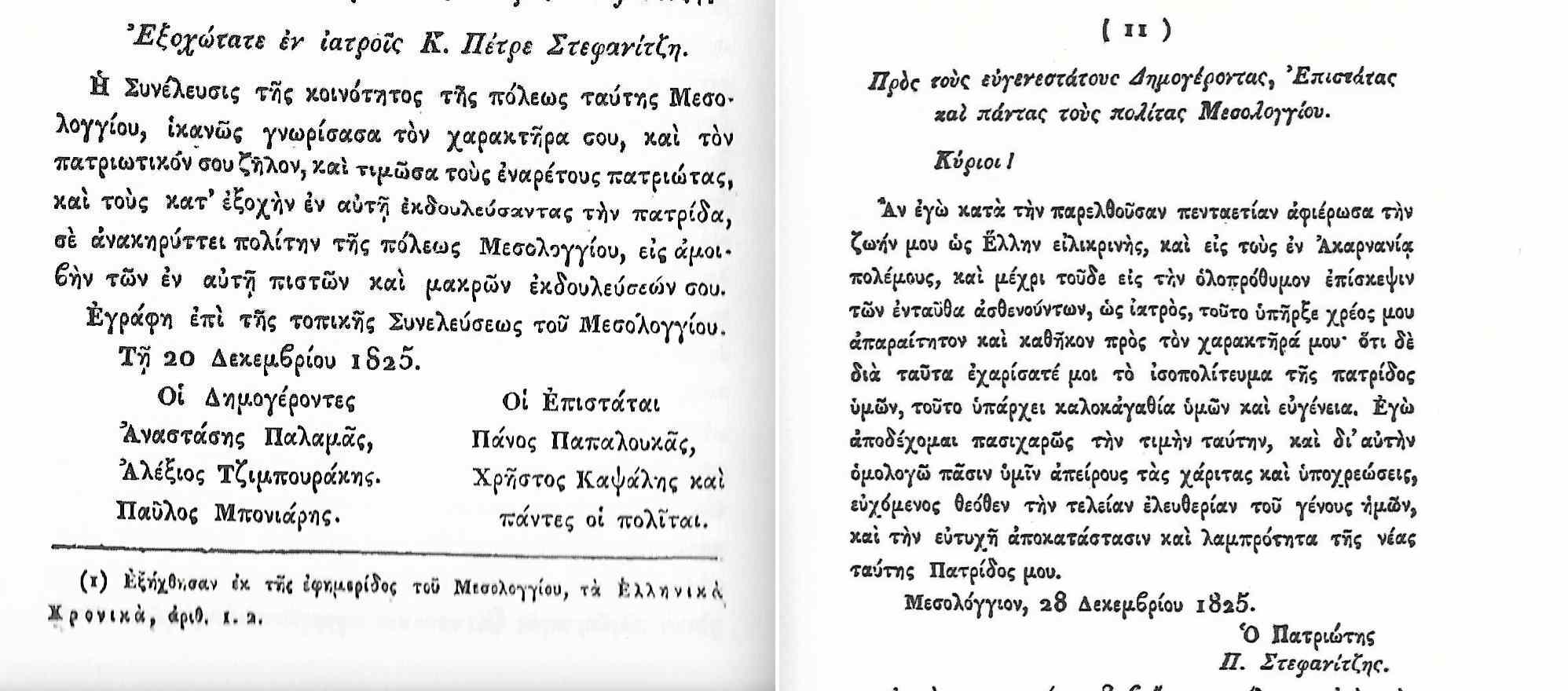 Εκμεταλλεύομαι την ευκαιρία και παρουσιάζω, σκαναρισμένα, από τις σελίδες 11-12 του πρωτότυπου δυο μικρά κείμενα, τα οποία δείχνουν την ευγνωμοσύνη της κοινότητας των Μεσολογγιτών στο πρόσωπο του Ανθρώπου και ιατρού Πέτρου Στεφανίτση αλλά και τις ευχαριστίες του τιμωμένου.