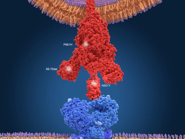 Τα τρία σημεία (λευκά σημεία με ετικέτες ονομασίας) στην ακίδα του SARS-CoV-2, όπου εντοπίζονται οι βασικότερες μεταλλάξεις στην παραλλαγή Β.1.1.7 του νέου κορονοϊού, γνωστότερη ως «βρετανική».