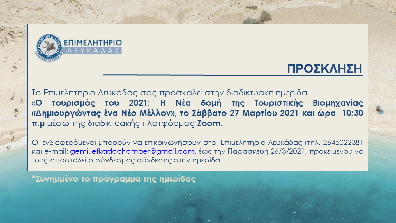 Το Επιμελητήριο Λευκάδας σε συνεργασία με το Πανεπιστήμιο Πειραιώς συνδιοργανώνουν το Σάββατο 27 Μαρτίου 2021, ώρα έναρξης: 10:30 π.μ., διαδικτυακά ημερίδα με θέμα: Ο τουρισμός του 2021: Η Νέα δομή της Τουριστικής Βιομηχανίας «Δημιουργώντας ένα Νέο Μέλλον»