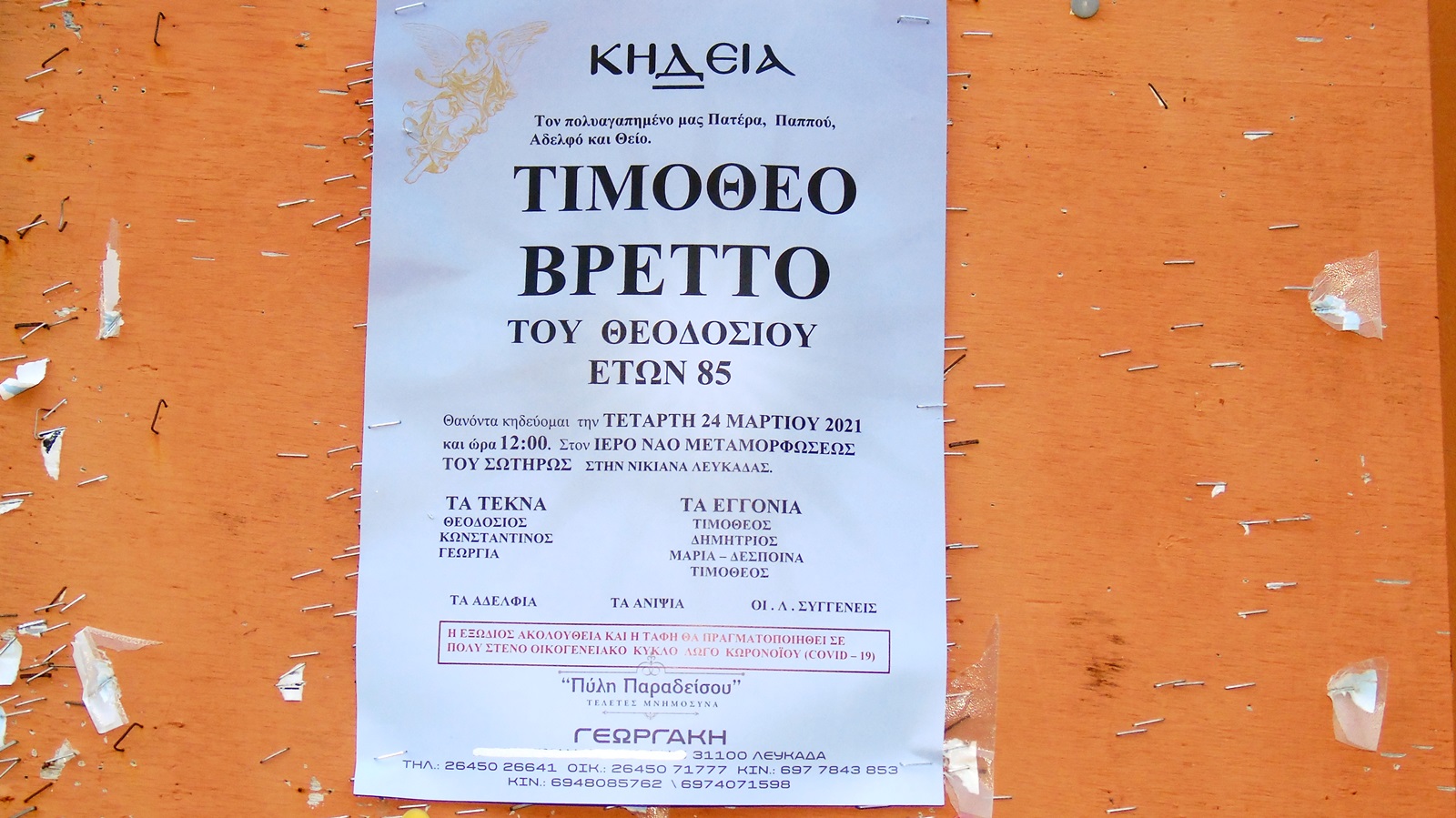 Αύριο, Τετάρτη 24 Μαρτίου 2021, στις 12.00 το μεσημέρι, θα γίνει από τον ενοριακό ναό Μεταμόρφωσης του Σωτήρος στη Νικιάνα, σε πολύ στενό οικογενειακό κύκλο λόγω του κορονοϊού, η κηδεία του Τιμόθεου Βρεττού (Πλιάτσικα) που «έφυγε» σε ηλικία 85 ετών από τη ζωή.