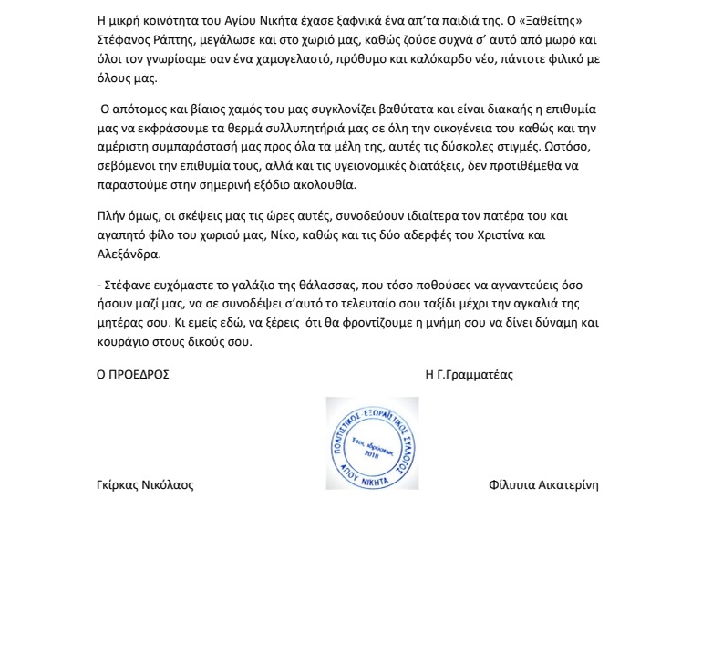 Ανακοίνωση του Πολιτιστικού Εξωραϊστικού Συλλόγου Αγίου Νικήτα για τον αδόκητο θάνατο του συμπολίτη μας Στέφανου Ράπτη: