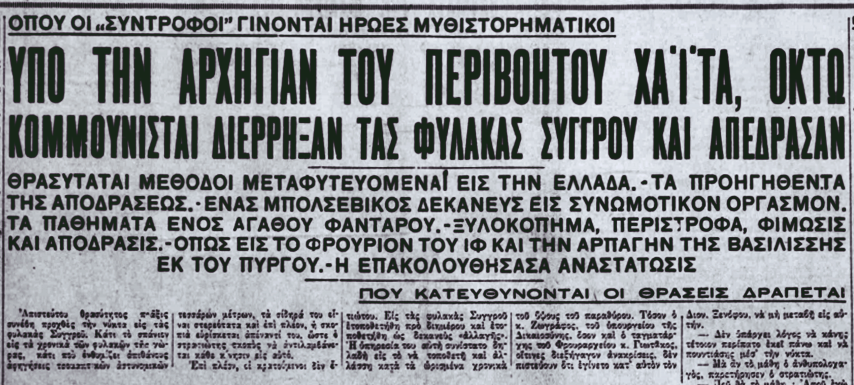 «… ΠΟΙΟΙ ΕΔΡΑΠΕΤΕΥΣΑΝ. Πάραυτα ειδοποιήθη η εσωτερική υπηρεσία των φυλακών και οι δεσμοφύλακες εισώρμησαν εις το κελλί των δραπετών. Εκ των κρατουμένων κομμουνιστών έλειπον οι οκτώ. Οι άλλοι είτε διότι πραγματικώς αυτό συνέβαινεν, είτε όχι, εφαίνοντο κοιμώμενοι. Αλλ΄ οι δραπετεύσαντες ήσαν αι κυριώτεραι φυσιογνωμίαι των κρατουμένων εις το κελλί εκείνο και του κομμουνιστικού κόμματος. Είχον δραπετεύσει δηλαδή οι εξής: Ανδρόνικος Χαϊτάς, Ελ. Αποστόλου και Περ. Καρασκόγιας. Είνε η περιβόητος τριμελής επιτροπή του κομμουνιστικού κόμματος, το μυστηριώδες αρχηγείον αυτού, μέχρι της ώρας καθ΄ ην συνελήφθη, ο από ετών καταζητούμενος Ευτυχιάδης ή Ηλιάδης Κωνστ., Παπαρήγος Δημ., ηγέται των κομμουνιστικών νεολαιών, Ορφεύς Οικονομίδης ο αιωνίως φυλακιζόμενος και υπεύθυνος συντάκτης του «Ριζοσπάστη», Ασίκης Βασίλειος εις των ζωηροτέρων προπαγανδιστών και Μαρίνος Μαρκοβίτης ο καταδικαστείς δια τας γνωστάς σκηνάς του Καλπακίου.