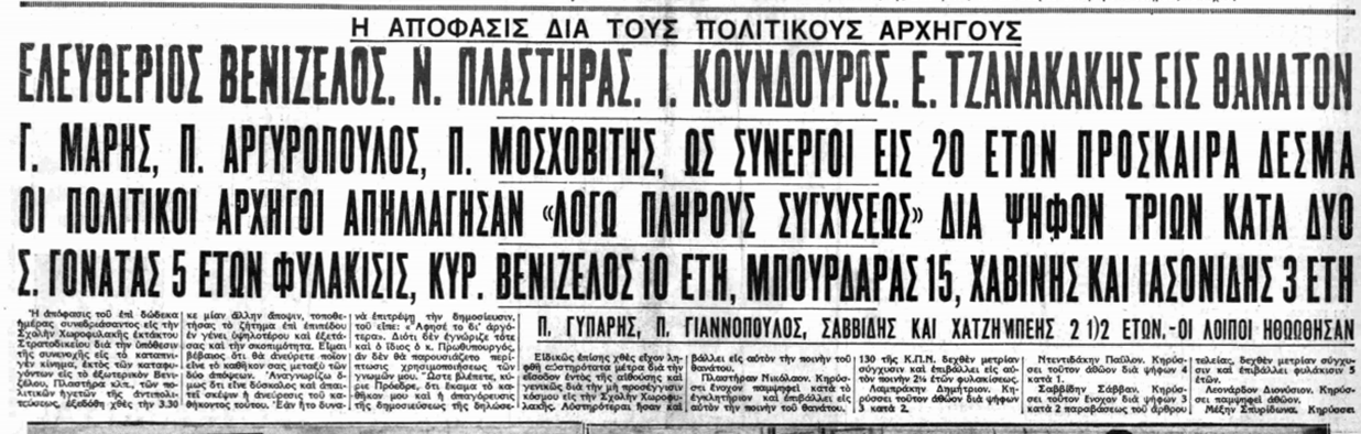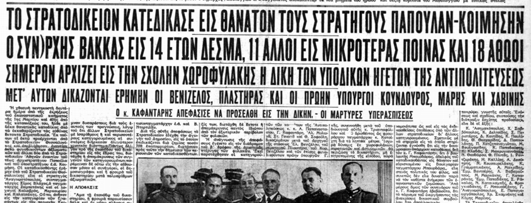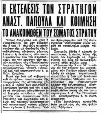 «Σήμερον την 5 και 30΄ πρωϊνήν εις τον όπισθεν του νοσοκομείου των Παίδων χώρον εξετελέσθη εν πλήρει στρατιωτική παρατάξει η υπό του Εκτάκτου Στρατοδικείου Αθηνών του δικάσαντας την στασιαστικήν δράσιν της οργανώσεως «Πανελλήνιος Δημοκρατική Άμυνα» επιβληθείσα ποινή εις τον αντιστράτηγον έ.α. Αν Παπούλιαν και υποστράτηγον έ. α. Μιλτ. Κοιμήσην.