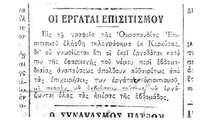 H συγκεκριμένη φωτογραφία είναι από δημοσίευμα της αστικής εφημερίδας «Αθήναι» της 1/1/1926. «Εις τα γραφεία της Ομοσπονδίας Επισιτισμού ελήφθη τηλεγράφημα εκ Κέρκυρας, δι΄ ου γνωρίζεται ότι οι εκεί εργοδόται κατόπιν εφαρμογής του νόμου περί εβδομαδιαίας αναπαύσεως απολύουν αυθαιρέτως από τας επιχειρήσεις των εργάτας επισιτισμού με σκοπό να εκβιάσουν τούτους να εργάζωνται όλας τας ημέρας της εβδομάδος».