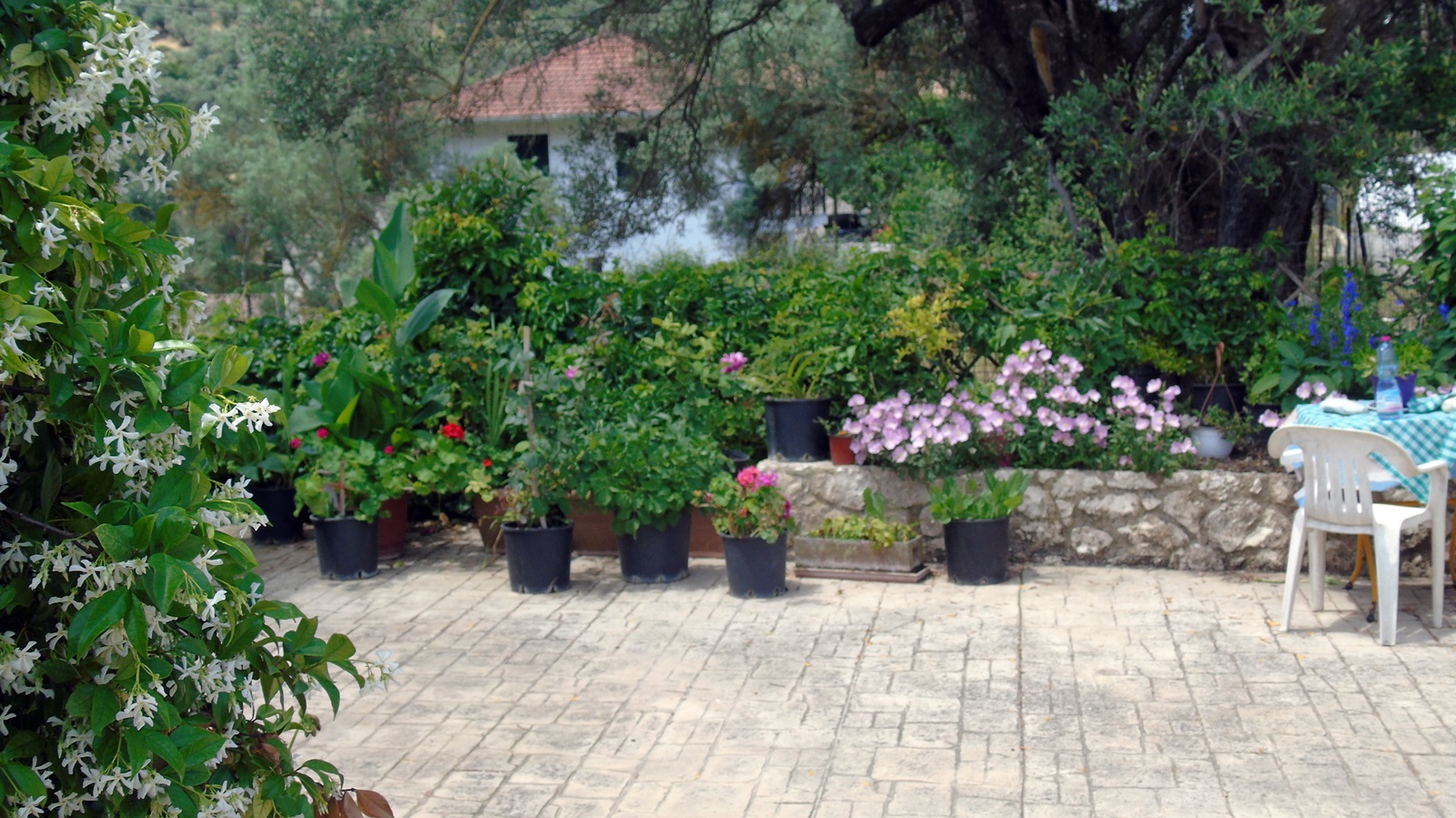 Στην όμορφη αυτή αυλή συνυπάρχουν παλιά μυριστικά μαζί με νέα καλλωπιστικά φυτά, όπως