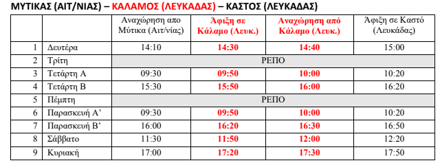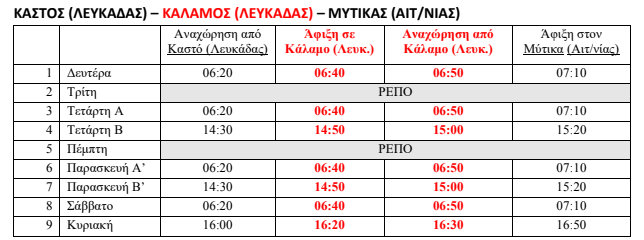 Τα δρομολόγια στη γραμμή Καστός-Κάλαμος-Μύτικας και επιστροφή από 07.06.2021 έως 30.06.2021