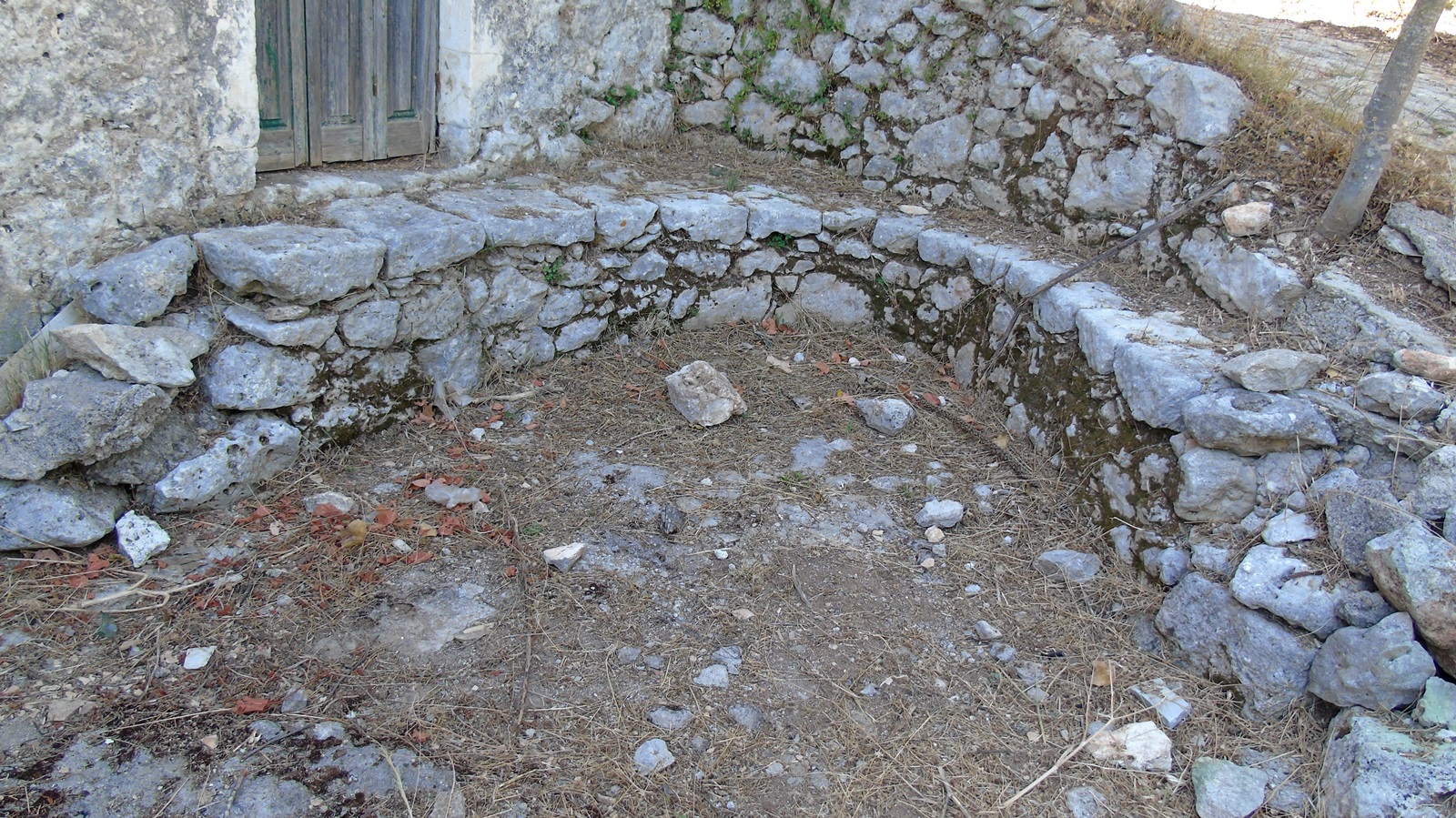 Ένα ημικυκλικό πέτρινο πεζούλι στην αυλή ενός σπιτιού στην ορεινή Λευκάδα… Συνήθως αυτά εκτείνονται σε ευθεία γραμμή κατά μήκος των εξωτερικών τοίχων των σπιτιών.