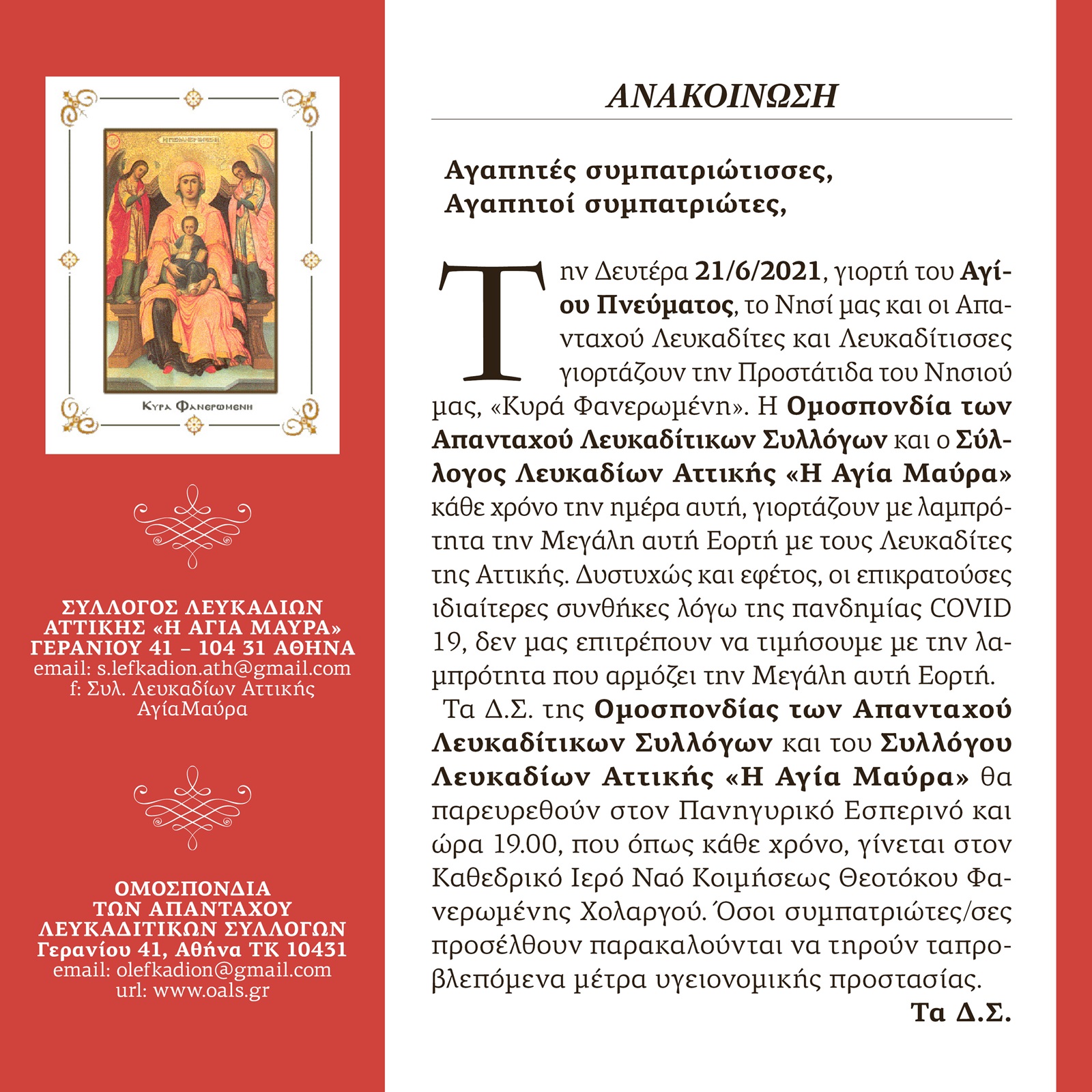 Αναλυτικά η ανακοίνωση η οποία συνυπογράφεται από τον Σύλλογο Λευκαδίων Αττικής «Η Αγία Μαύρα» και την Ομοσπονδία των Απανταχού Λευκαδίτικων Συλλόγων.