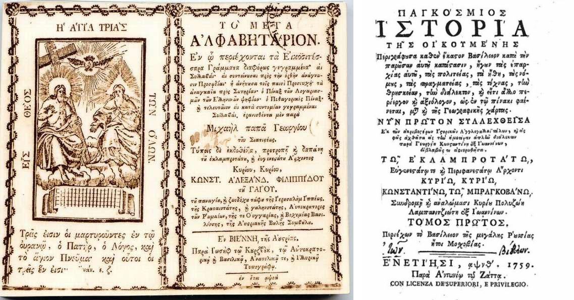 Εικ. 4 (1) και 5 (2). 1. To Μέγα Αλφαβητάριον του Μιχαήλ Παπά Γεώργιου, Βιέννη 1771. Το πρώτο ελληνικό αλφαβητάριο της νεώτερης εποχής, ανάρτηση, 17/6/21, https://el.wikipedia.org/wiki/%. 2. Η πρώτη σελίδα του έργου Παγκόσμος Ἰστορία τῆς Οἰκουμένης του Γεωργίου Κωνσταντίνου, 1759, Βενετία, ανάρτηση, 17/6/21, https://el.wikipedia.org/wiki/%