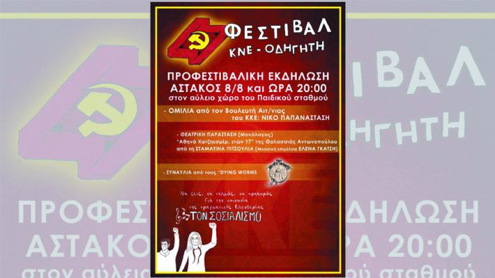 Με αυτές τις «παραινέσεις» προετοιμάζεται και η εκδήλωση του 47ου Φεστιβάλ της ΚΝΕ και του «Οδηγητή», στον Αστακό, που θα πραγματοποιηθεί την Κυριακή 8 Αυγούστου, στις 20.00, στον αύλειο χώρο του Παιδικού Σταθμού.