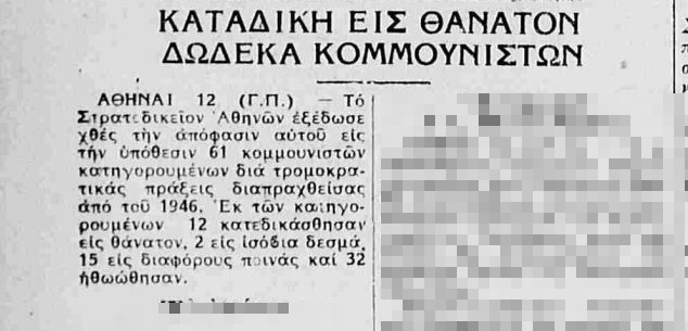 Σαν σήμερα το 1950 εκδίδεται η απόφαση του Στρατοδικείου για τους 61 κομμουνιστές του Δημοκρατικού Στρατού Αθήνας. Καταδικάστηκαν δύο φορές σε θάνατο οι Παντελής Κιουρτσής, Ηρακλής Μποζατζίδης, Βασίλης Παπαγιαννόπουλος, Τηλέμαχος Μεταξωτός, Ι. Ίσαρης και μία φορά σε θάνατο ο Χριστόφορος Σωτηράκος.