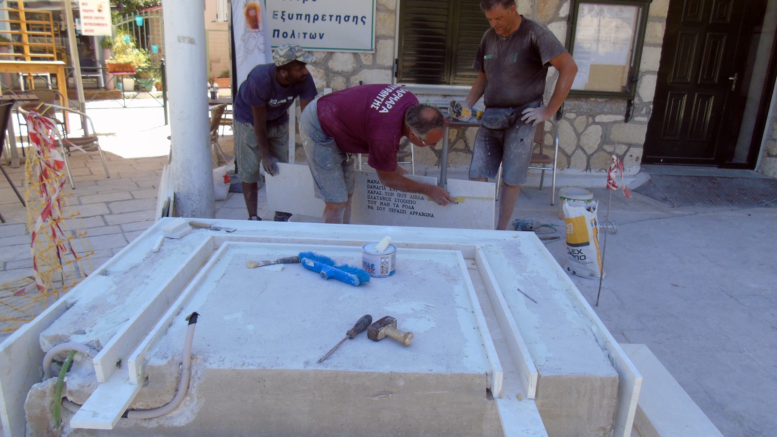 Την πρόσοψη του βάθρου του αγάλματος, οι εργασίες κατασκευής του οποίου βρισκόταν το απόγευμα της περασμένης Τρίτης σε εξέλιξη, είναι χαραγμένος ένας στίχος άγνωστου σε μας ποιητή (όπως άγνωστη παραμένει ακόμα μια λέξη του ποιήματος – χωρίς αυτό να σημαίνει και τίποτα καθώς οι ποιητές είναι και λεξιπλάστες), που γράφει τα εξής: