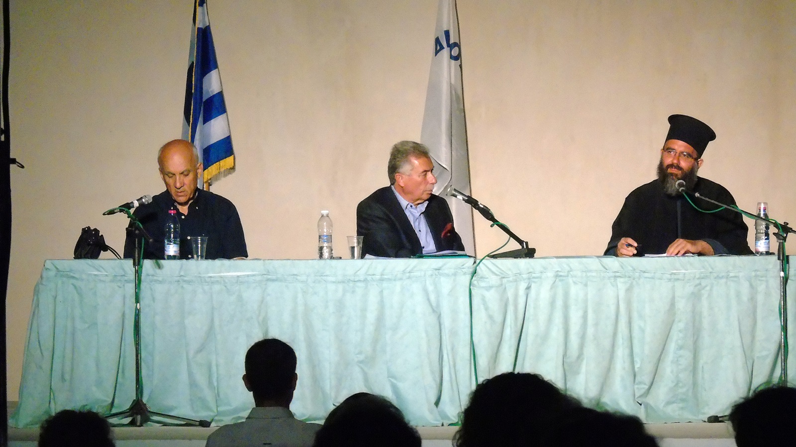 Δύο ομιλητές της δεύτερης ημέρας: Τάκης Τσερές και π. Ιωαννίκιος. Στο μέσον ο κ. Νίκος Κορδόσης, Πρόεδρος του πάνελ.