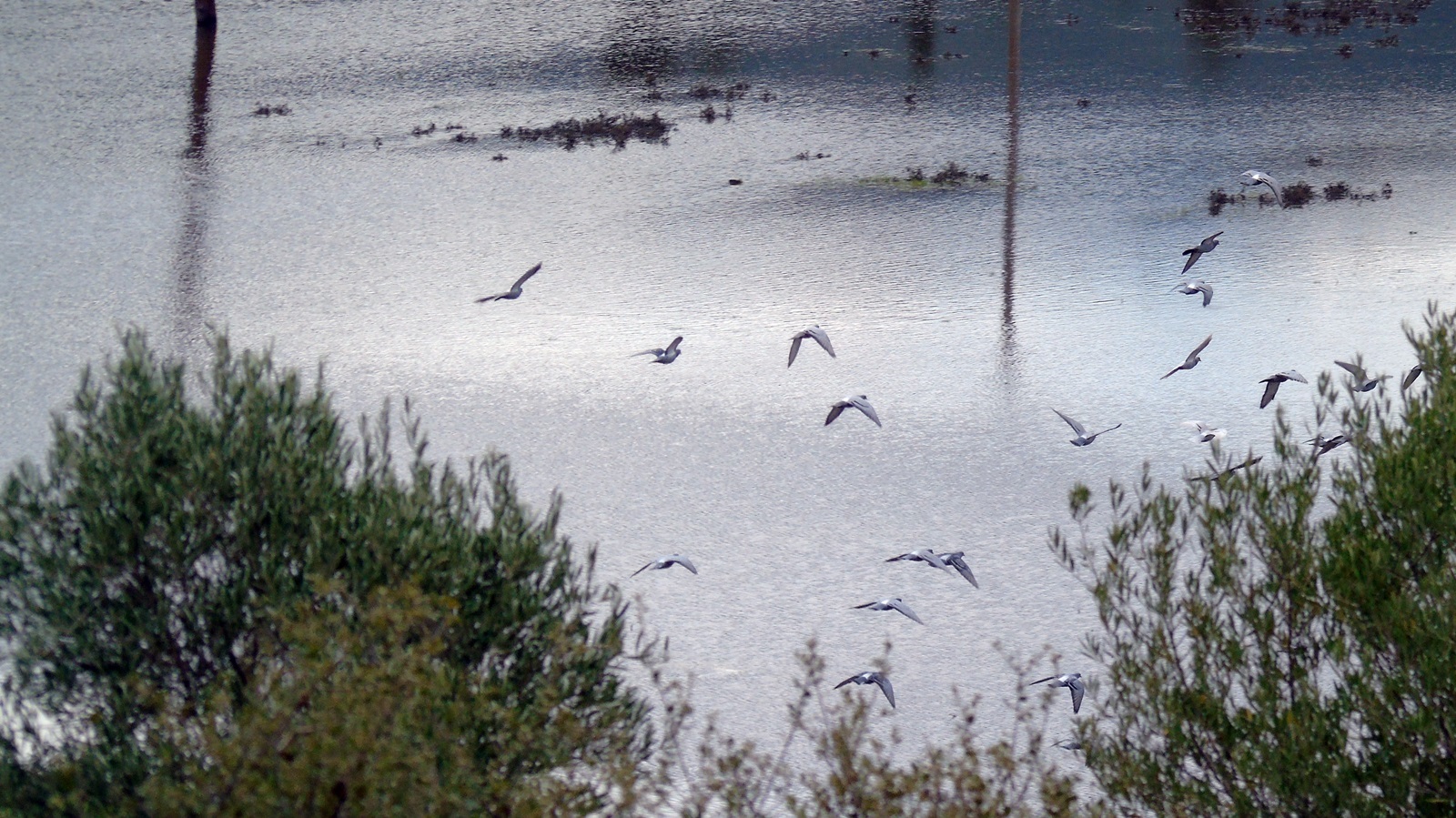 Εκτός από τα συνηθισμένα αρπακτικά πουλιά του τόπου μας, τα κοράκια και τις καρακάξες, ένα σμήνος αγριοπερίστερα απολάμβαναν τις πρώτες ακτίνες του ήλιου στις όχθες του λιβαδιού, για να φτερουγίσουν γρήγορα μακρυά μόλις μας αντιλήφθηκαν.