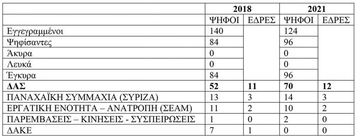 Σε πρώτη δύναμη και με αύξηση σε ψήφους και ποσοστά αναδείχτηκε η Δημοκρατική Αγωνιστική Συνεργασία (ΔΑΣ) κατά την ολοκλήρωση την Παρασκευή 22 Οκτώβρη των αρχαιρεσιών του Εργατικού Κέντρου Πάτρας, για ανάδειξη νέας Διοίκησης, Ελεγκτικής Επιτροπής και Αντιπροσώπων στη ΓΣΣΕ. Συγκεκριμένα η ΔΑΣ έλαβε τώρα 70 ψήφους καταλαμβάνοντας 12 έδρες, (52 ψήφοι και 11 έδρες το 2018). Δείτε παρακάτω τα αποτελέσματα.