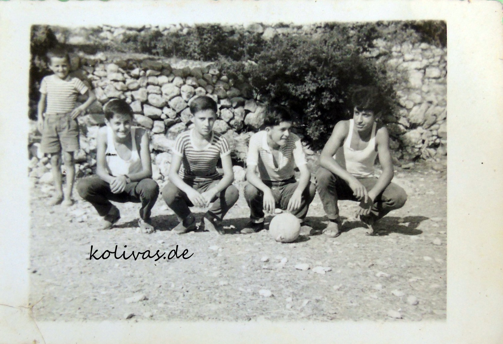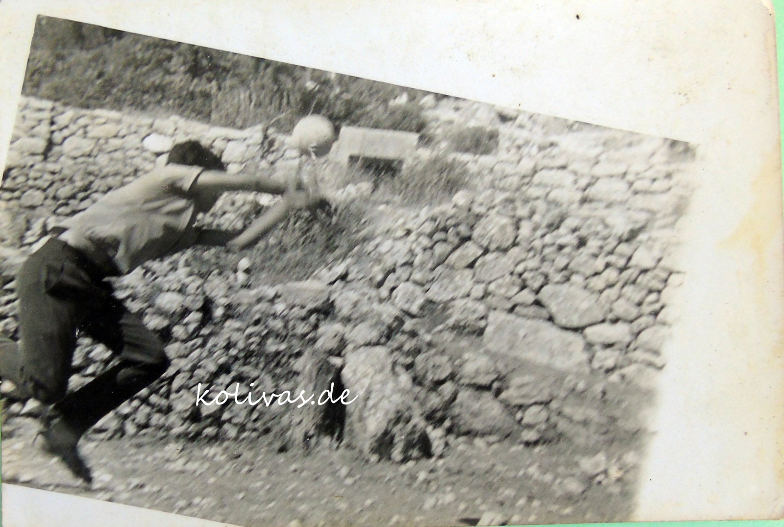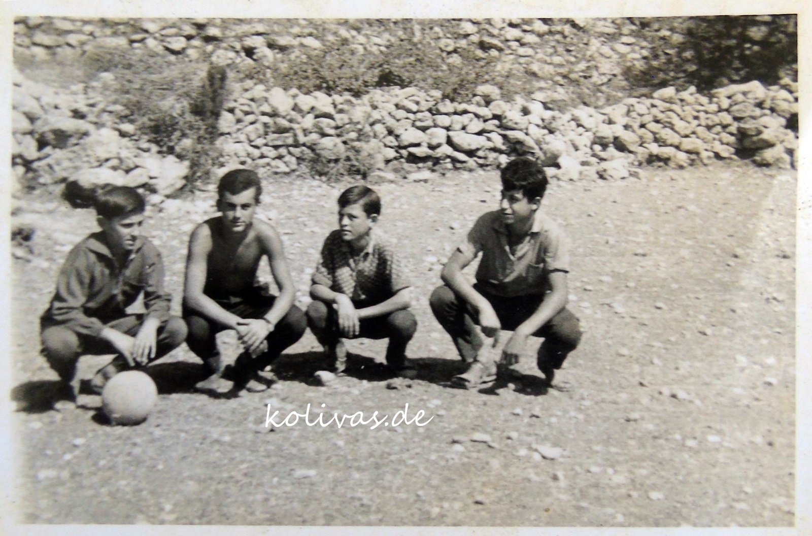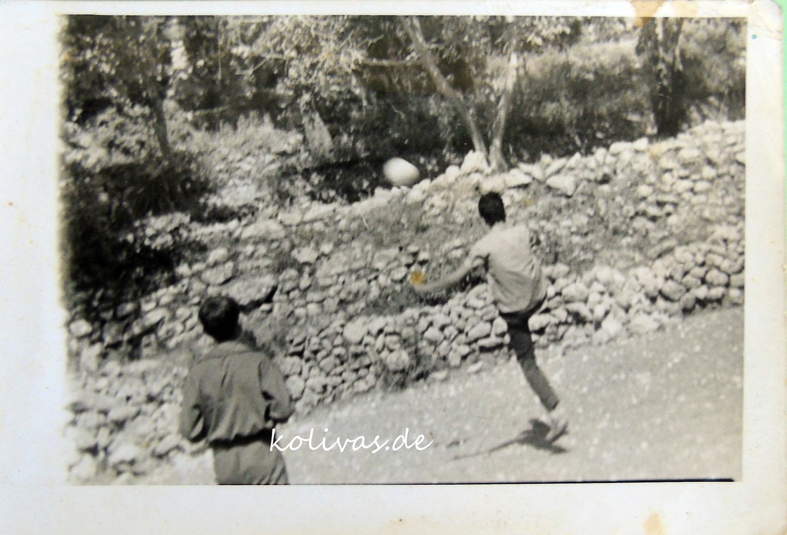 Η μπάλα στον αέρα… Διακρίνεται στο βάθος η ψιλή ξερολιθιά από το χωράφι του Ξενοφώντα Βρεττού. Ο «αγωνιστικός χώρος» είναι γεμάτος μικρές πέτρες παρότι τον καθαρίζαμε που και που.