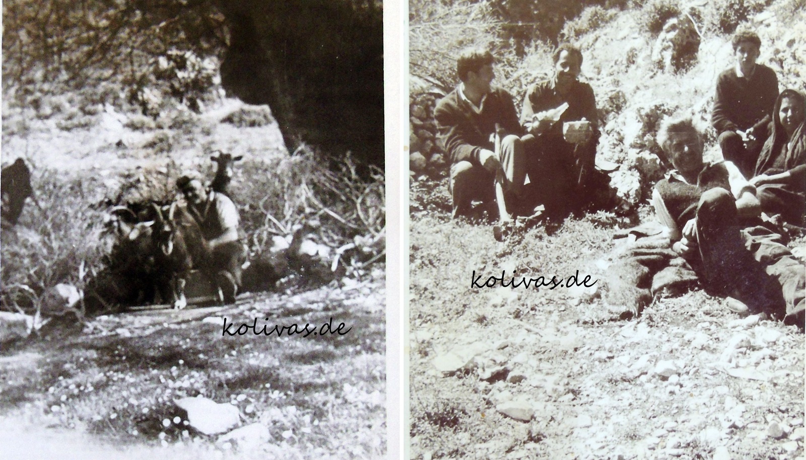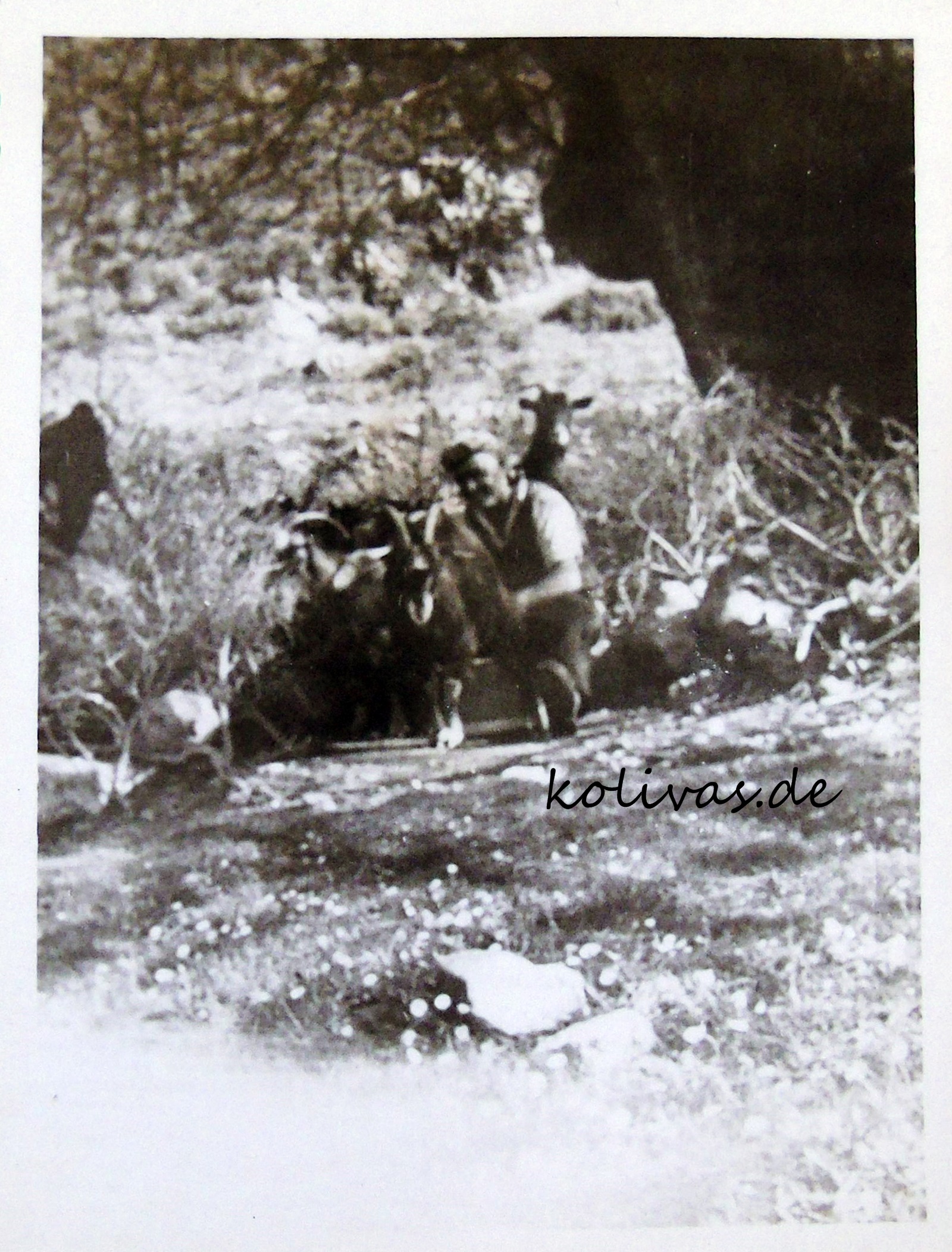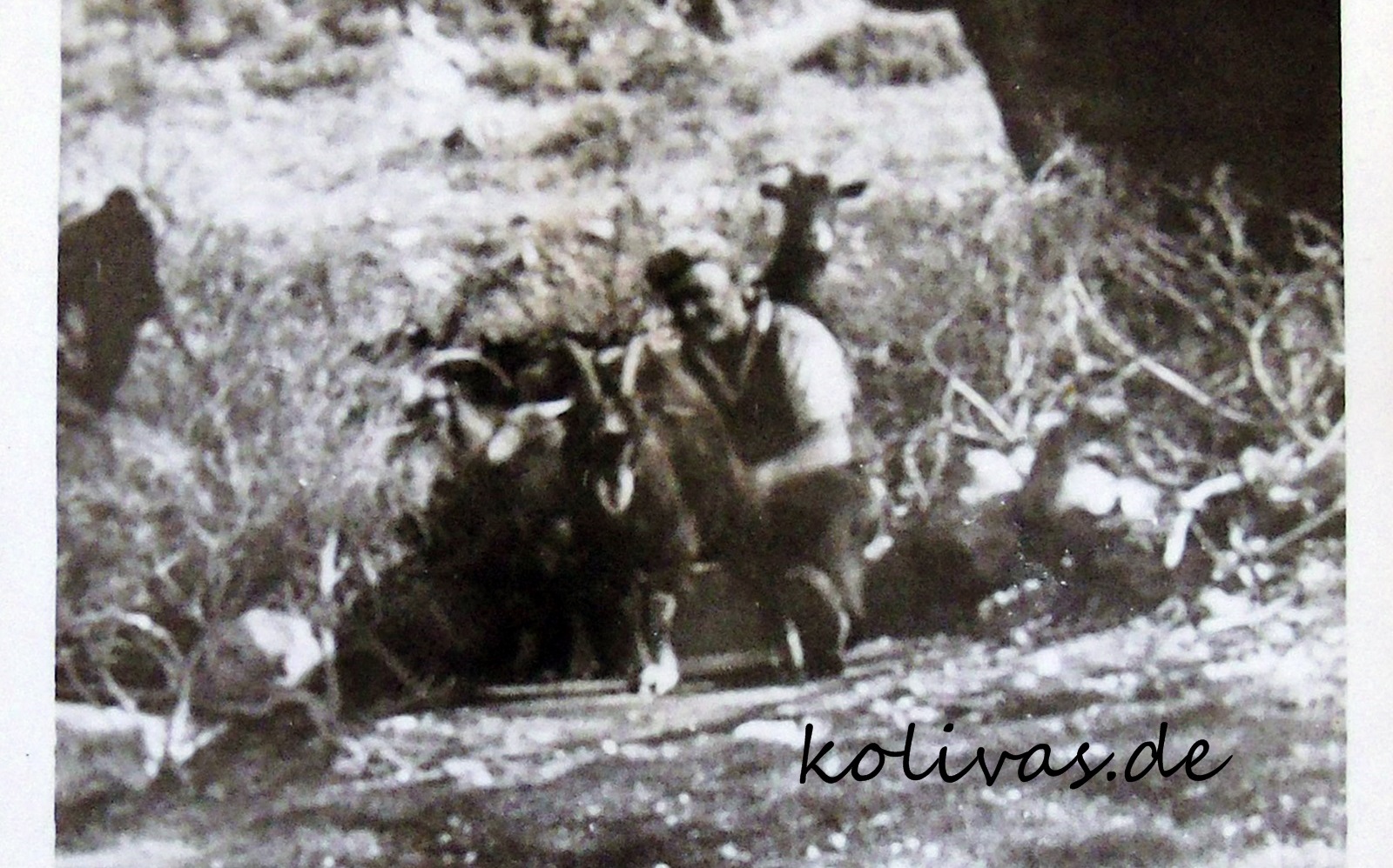 Στην πρώτη φωτογραφία εικονίζεται ο Λάκης Κολυβάς (Μπερδεμπές) να αρμέγει τις γίδες του στο σημείο που είχε τη στάνη του. Πίσω δεξιά διακρίνεται ο χοντρός κορμός από το αιωνόβιο ρουπάκι (βελανιδιά) που η ηλικία του υπολογίζεται πρόχειρα να είναι άνω των 1.000 ετών. Όπως μας έχει πει ο ίδιος είχε μετρήσει κάποτε την περίμετρό του με το λουρί της ζώνης του. Μια ακριβέστερη μέτρηση δείχνει να είναι 6.90 μ., ενώ το ύψος του θα πρέπει να ξεπερνά τα 20-25 μέτρα.