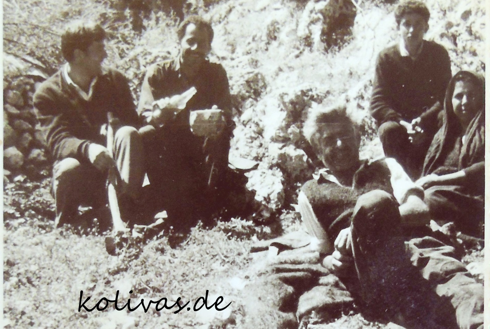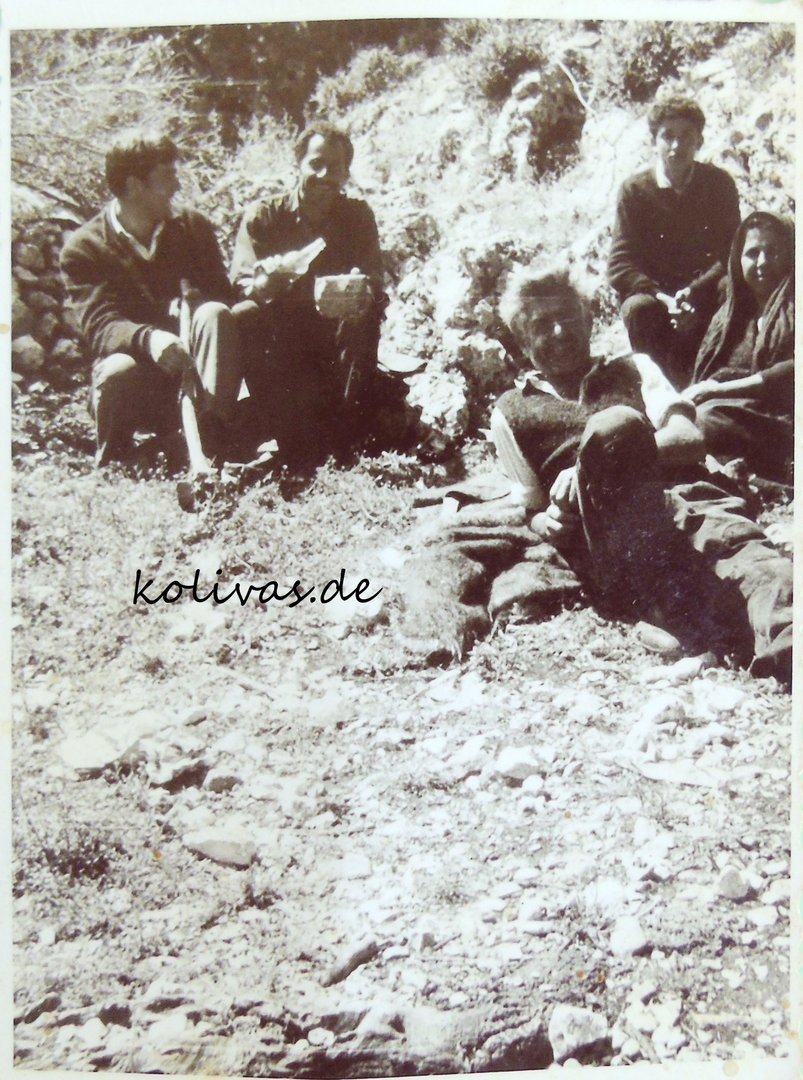 Στην δεύτερη φωτογραφία εικονίζονται σε στιγμές χαλάρωσης ο Λάκης Κολυβάς (Μπερδεμπές) μπροστά στη φωτογραφία και πίσω η γυναίκα του Φροσύνη. Ξεχωρίζουμε ακόμη τον Γιώργο Σούνδια (Βασίλα), δεύτερος από αριστερά στην πίσω σειρά. Οι άλλοι δυο μας είναι άγνωστοι.