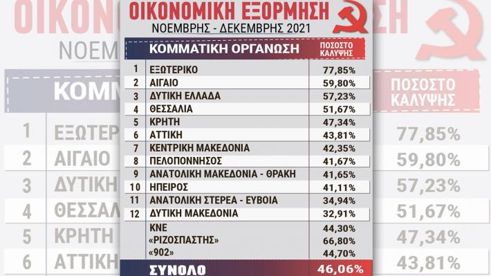 Η ΚΝΕ κάλυψε το 44,30% του πλάνου της, η ΚΟ «Ριζοσπάστη» το 66,80% και η ΚΟ «902» το 44,70%.