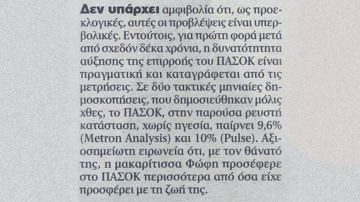 «Αξιοσημείωτη ειρωνεία ότι, με τον θάνατό της, η μακαρίτισσα Φώφη προσέφερε στο ΠΑΣΟΚ περισσότερα από όσα είχε προσφέρει με τη ζωή της», αναφέρει μεταξύ άλλων στο άρθρο του.
