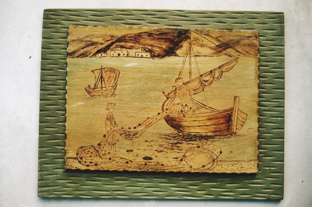 Μου είχε διηγηθεί σχετικά ο μπάρμπα Κώστας: «Τις χειροτεχνίες τις δίναμε σε κάποιους Καλαματιανούς που ήταν κι αυτοί εξόριστοι και τις πουλούσαν μέσω συγγενών τους σε μαγαζιά τουριστικών ειδών στην Καλαμάτα, που είχε από τότε τουρισμό. Βγάζαμε κάποια χρήματα που ένα μέρος τους το δίναμε στην ομάδα συμβίωσης του στρατοπέδου […] Όταν απολύθηκα έκανα πολλά δώρο στους χωριανούς. Κάτι πουλάκια που περίσσεψαν τα έδωσα στον Α. που είχε κατάστημα τουριστικών ειδών και τα πουλούσε. Τις πυρογραφίες μού τις έφερε πίσω για δεν πουλιούνταν. Κάπου τις έχω…».