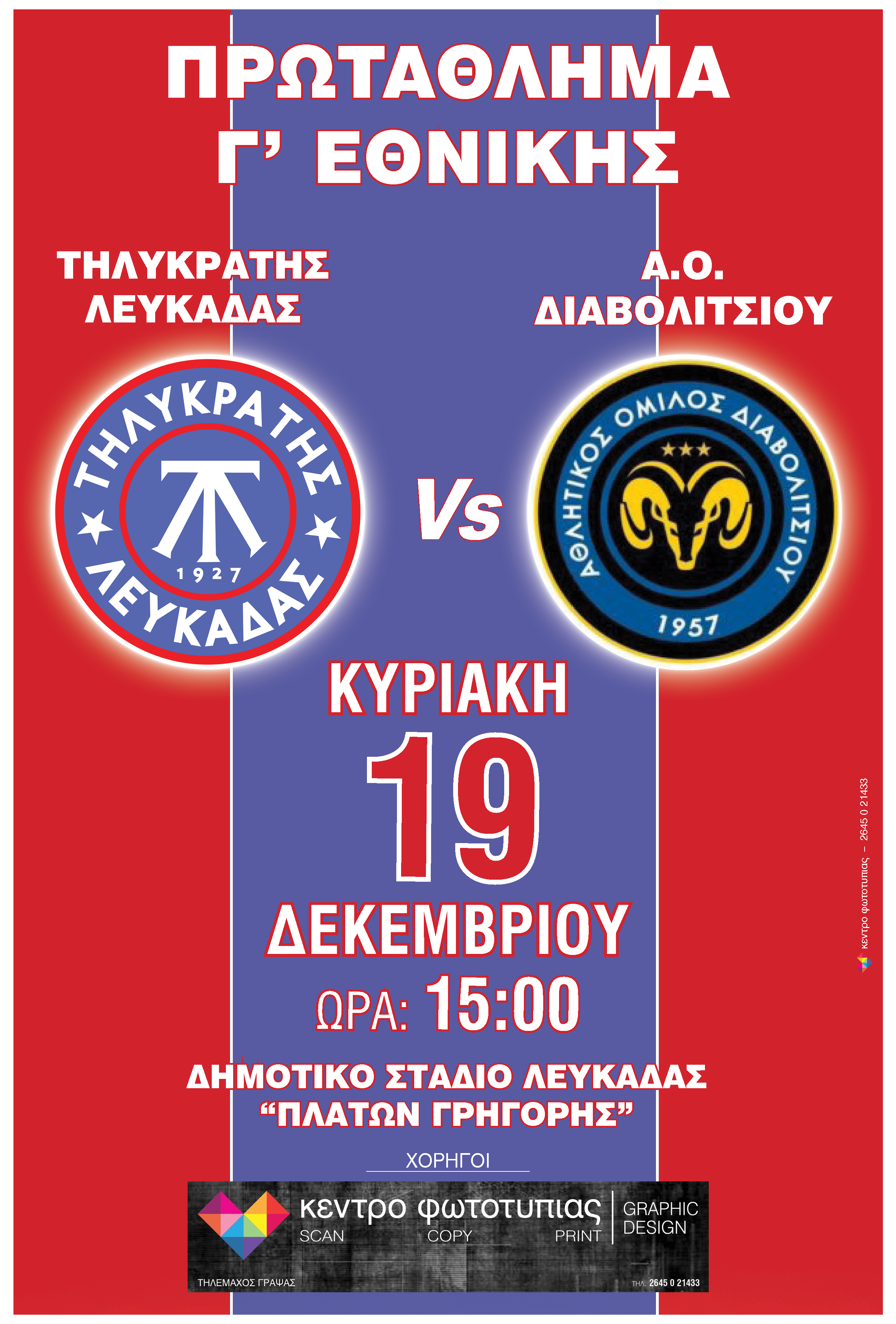 Τον ΑΟ Διαβολιτσίου υποδέχεται ο Τηλυκράτης την Κυριακή 19 Δεκέμβρη 2021, στις 3.00 το απόγευμα, στο Δημοτικό Στάδιο Λευκάδας «Πλάτωνας Γληγόρης», για την 11η αγωνιστική του πρωταθλήματος της Γ΄ Εθνικής κατηγορίας (4ος Όμιλος).