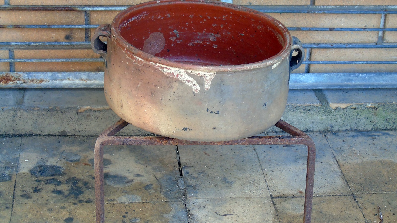 Μια παδέλα όπως είναι στο λευκαδίτικο γλωσσάρι (νταβάς, πήλινο τσουκάλι, αλλού κ.λ.π.) και μια πυροστιά. (Το συνδυάζω και με μια παλιότερη δημοσίευση για τα παλιά πήλινα πιάτα).