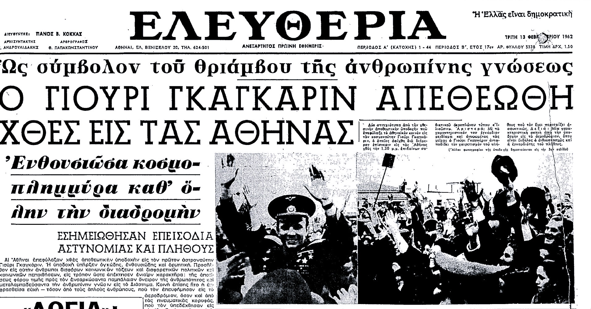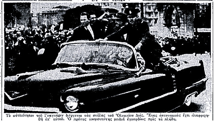 «Ως σύμβολον του θριάμβου της ανθρωπίνης γνώσεως ο Γιούρι Γκαγκάριν απεθεώθη χθες εις τας Αθήνας – Ενθουσιώσα κοσμοπλημμύρα καθ΄ όλην την διαδρομήν – Εσημειώθησαν επεισόδια μεταξύ αστυνομίας και πλήθους.
