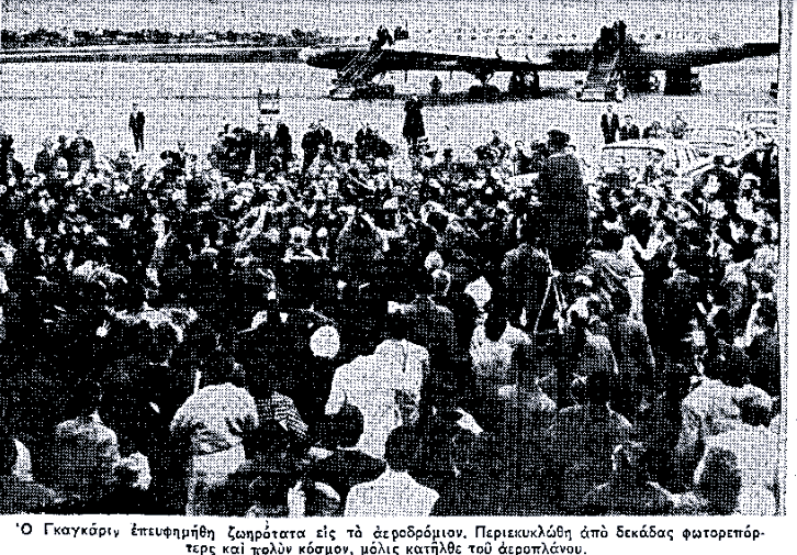 Σύμφωνα με το ρεπορτάζ της εφημερίδας, το αεροπλάνο της «Αεροφλότ», ένα λευκό τετρακινητήριο «Ιλιούσιν 18», που μετέφερε τον Γκαγκάριν προσγειώθηκε στις 1.04 μ.μ. στο αεροδρόμιο του Ελληνικού. Ισχυρότατες αστυνομικές δυνάμεις με επικεφαλής τον διευθυντή της Αστυνομίας Αθηνών που είχαν φτάσει από το πρωί είχαν εγκαταστήσει διπλό φράγμα από συρματόσχοινο από την είσοδο του αεροδρομίου μέχρι το περίπτερο υποδοχής των ξένων, ενώ ο κόσμος κάλυπτε και τις δύο πλευρές του διαδρόμου μήκους περίπου 500 μέτρων που είχε σχηματιστεί. Πάνω από 5.000 άτομα είχαν φτάσει στο αεροδρόμιο να υποδεχτούν τον σοβιετικό κοσμοναύτη πολλοί εκ των οποίων κρατούσαν την φωτογραφία του.