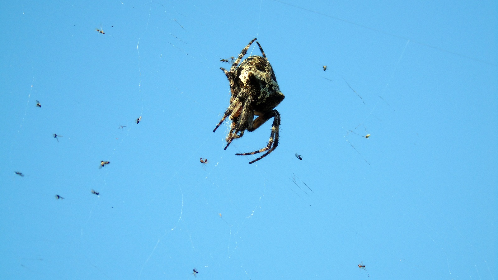 Τη φωτογραφήσαμε το καλοκαίρι στο δάσος των Σκάρων. Την εποχή αυτή φράζουν κυριολεκτικά με τον ιστό τους που τον στήνουν από τη μια στην άλλη άκρη τα έτσι κι αλλιώς στενά μονοπάτια και συνήθως όταν περπατάμε έχουμε μπροστά μας ένα μπαστούνι ή ένα μικρό ραβδάκι για να ανοίγουμε το δρόμο, εν γνώσει μας ότι έτσι χαλάμε, δυστυχώς, και τη φωλιά τους που παγιδεύουν τα έντομα. Στις φωτογραφίες διακρίνονται μυγούλες που έχουν παγιδευτεί στα νήματα του ιστού.